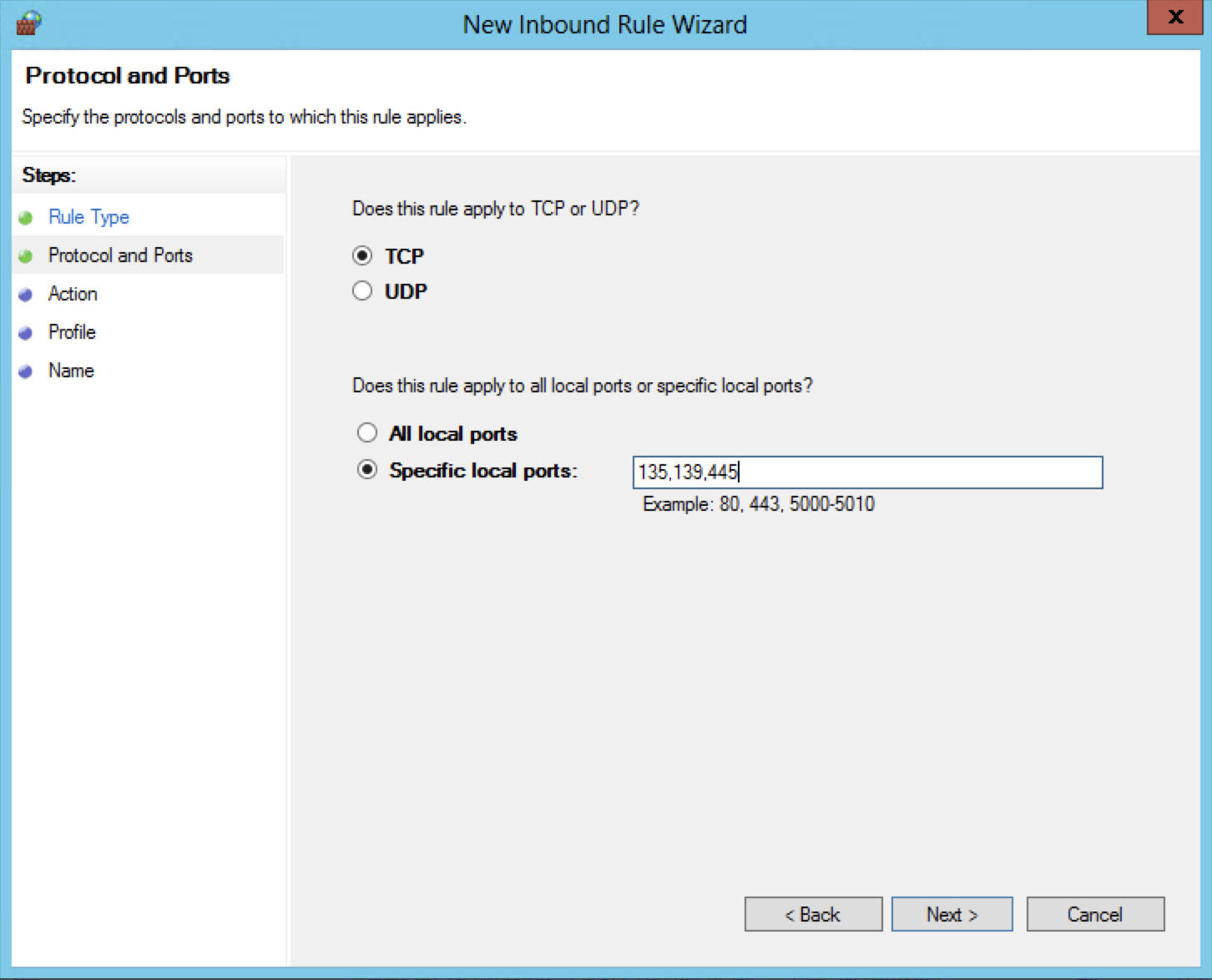 ภาพที่ 3 ตั้งค่า Firewall กรอกตัวเลข Port 135,139,445