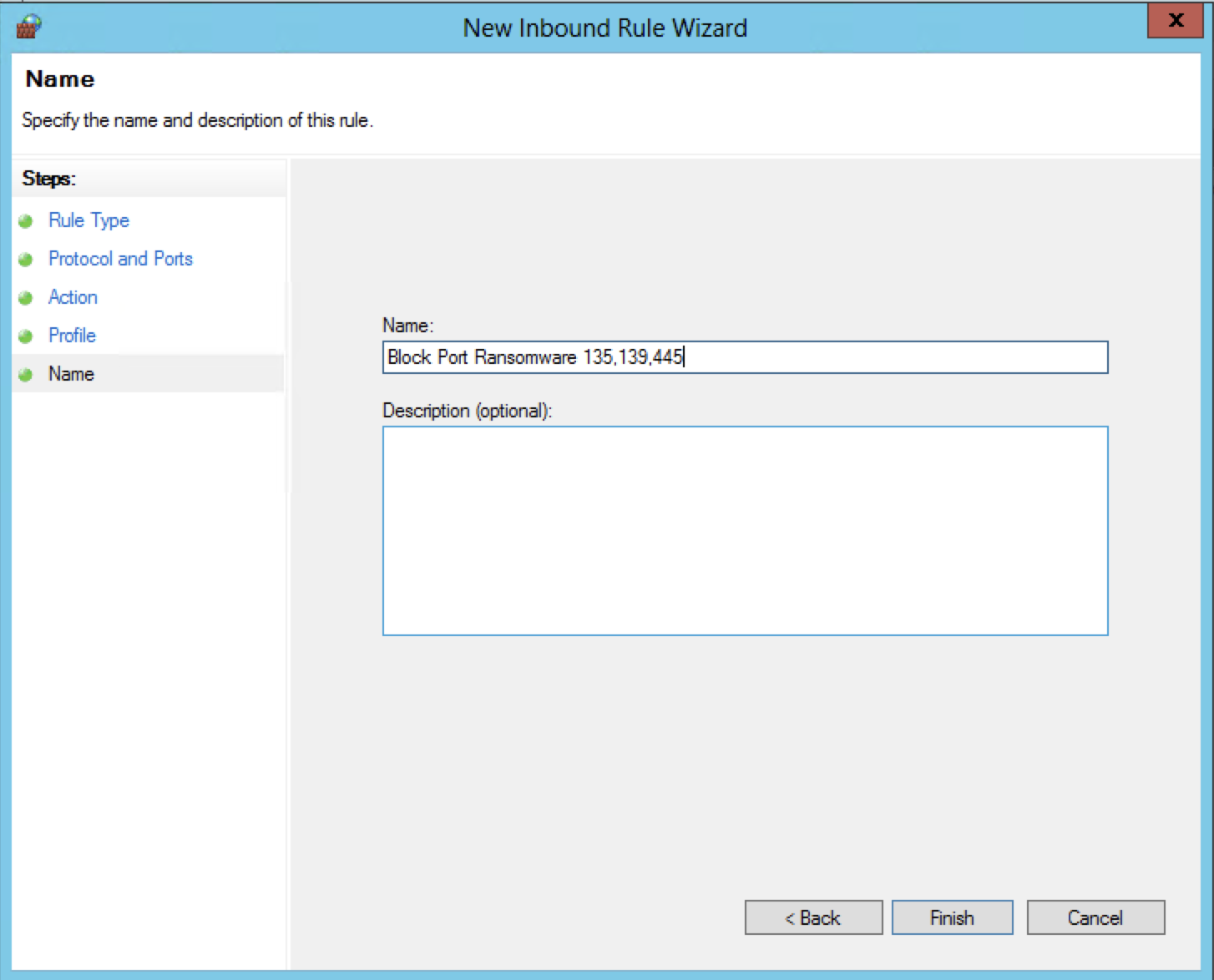 ตั้งชื่อ Rule อะไรก็ได้ ในที่นี้ ตั้งเป็น Block Port Ransomware 135,139,445 ดังภาพ คลิกปุ่ม Finish เป็นอันเรียบร้อย