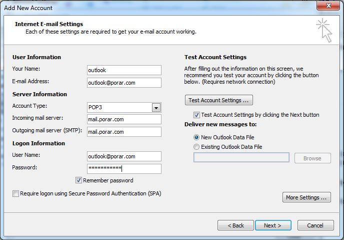 E-mail Address : ใส่ชื่ออีเมลล์ของคุณ เช่น outlook@porar.com (โดยปกติจะใส่มาให้อยู่แล้ว ตรวจสอบให้ถูกต้อง)
