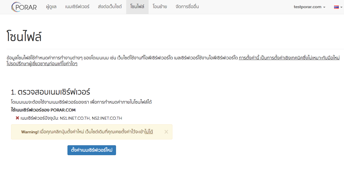 ดังนั้น ระบบจะมีการตรวจเช็ค หากการตั้งค่าเนมเซิร์ฟเวอร์ไม่ถูกต้อง ระบบจะมีปุ่มให้คลิก 'ตั้งค่าใหม่'