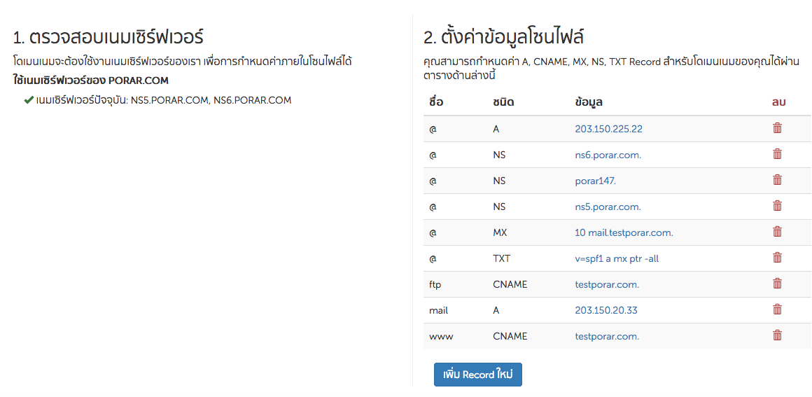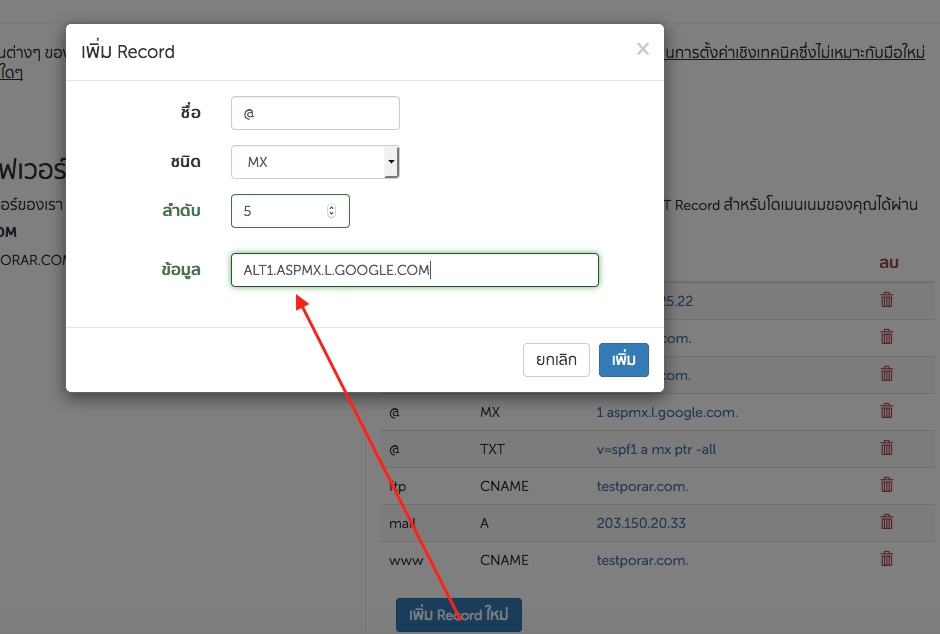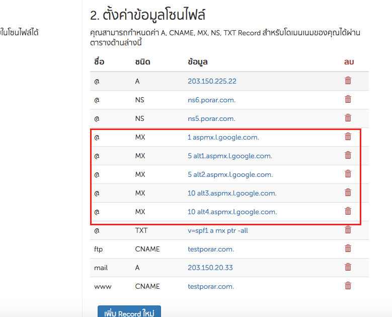 ลูกค้าสมัครใช้บริการ G Suite ผ่านเว็บไซต์ https://gsuite.google.com/ ซึ่งแล้วแต่ Plan ที่ลูกค้าเลือกใช้บริการ แต่สุดท้าย ทาง Google จะแจ้งรายละเอียด วิธีการตั้งค่า MX Record ของโดเมนเนมให้ชี้ไปยังระบบของ Google ดังภาพตัวอย่าง Blank or @ 3600 MX 1 ASPMX.L.GOOGLE.COM Blank or @ 3600 MX 5 ALT1.ASPMX.L.GOOGLE.COM Blank or @ 3600 MX 5 ALT2.ASPMX.L.GOOGLE.COM Blank or @ 3600 MX 10 ALT3.ASPMX.L.GOOGLE.COM Blank or @ 3600 MX 10 ALT4.ASPMX.L.GOOGLE.COM