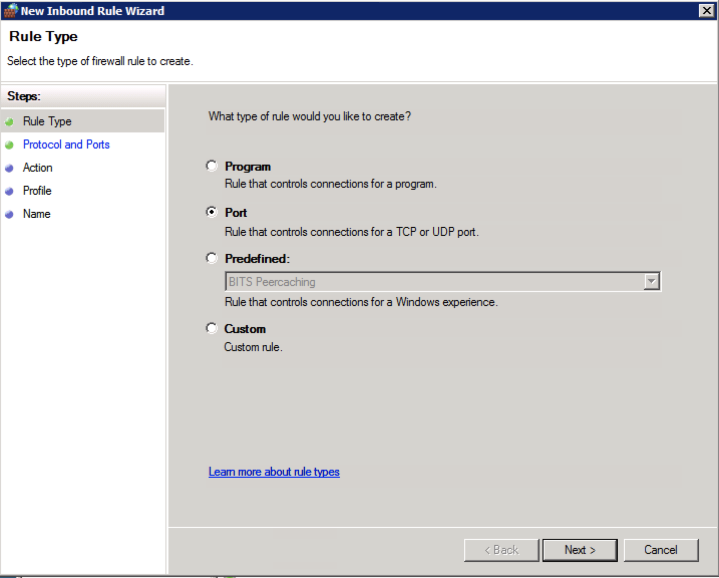 คลิกเมาส์ขวาที่ Inbound Rule > New Rule ระบบจะเปิดหน้าต่าง New Inbound Rule Wizard ใหม่ขึ้นมา เลือก Port กดปุ่ม Next