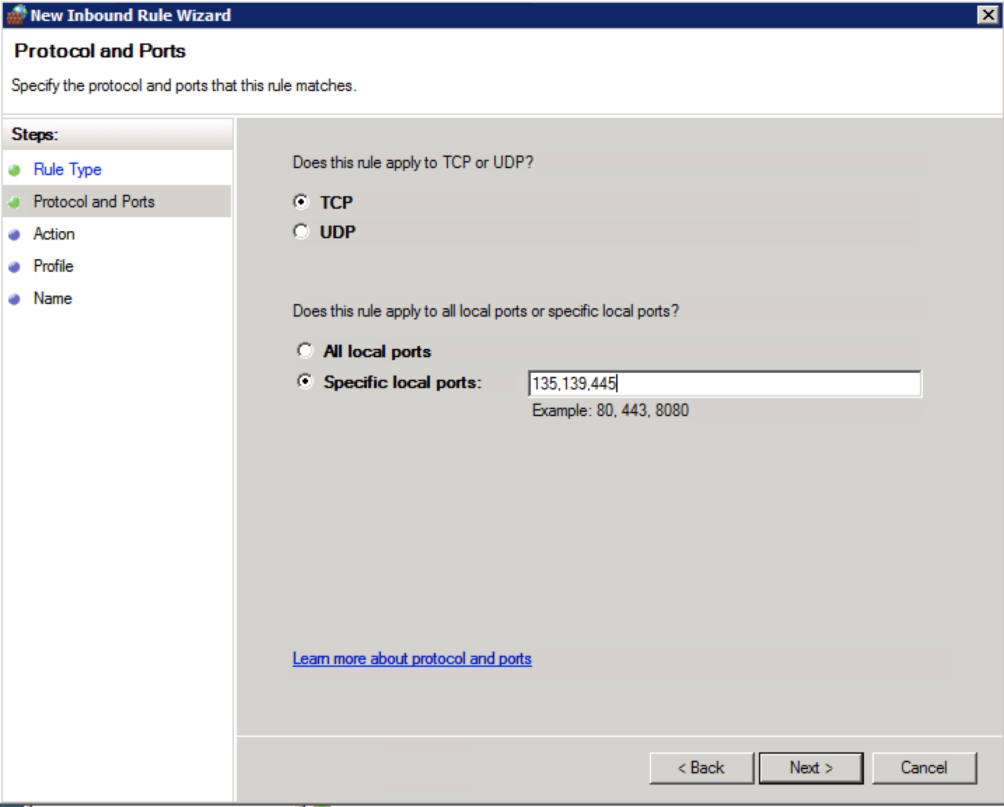 ภาพที่ 3 ตั้งค่า Firewall กรอกตัวเลข Port 135,139,445