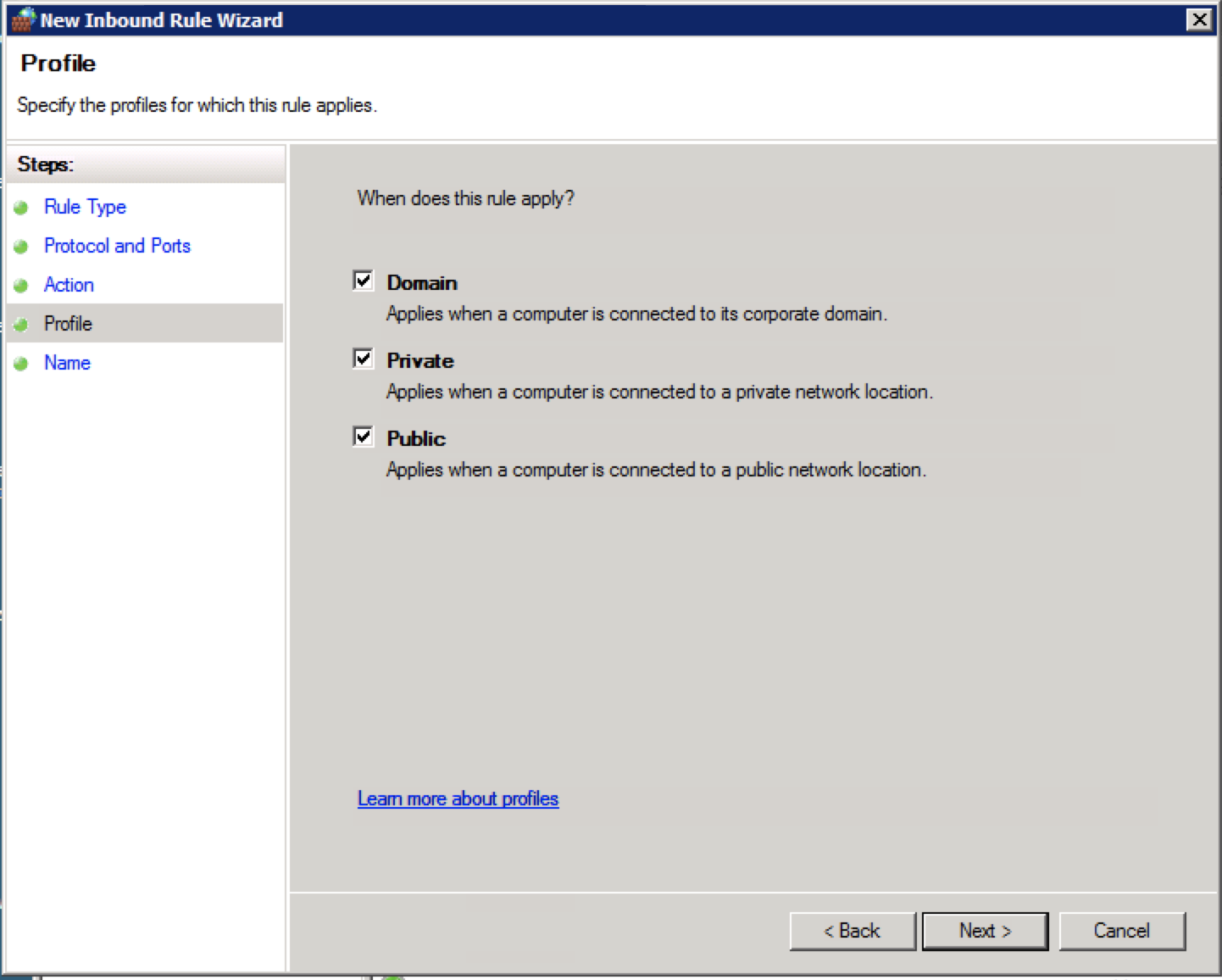 ภาพที่ 5 ตั้งค่า Firewall เลือกทั้ง Public, Private, Domain