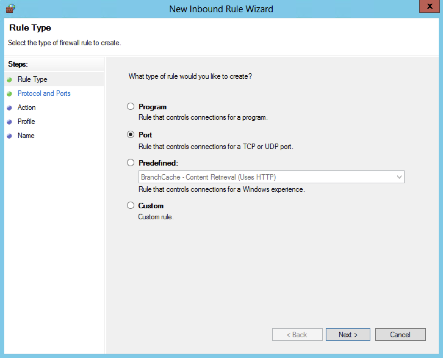 คลิกเมาส์ขวาที่ Inbound Rule > New Rule ระบบจะเปิดหน้าต่าง New Inbound Rule Wizard ใหม่ขึ้นมา เลือก Port กดปุ่ม Next
