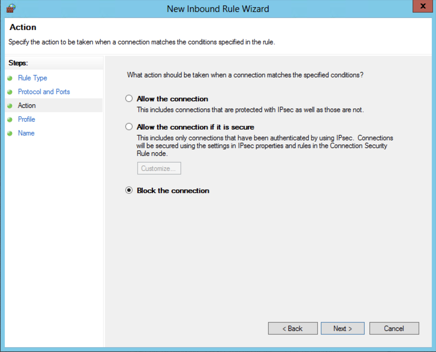เลือก Block the connection แล้วคลิกปุ่ม Next